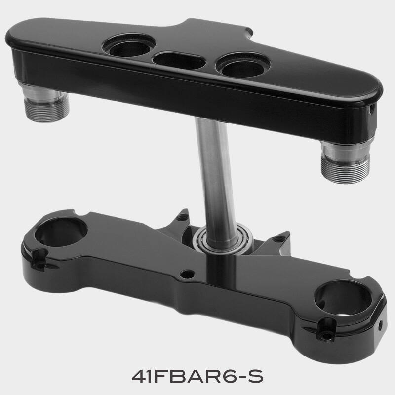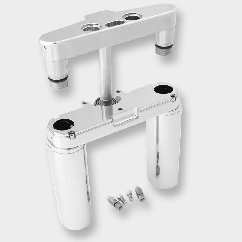This HHI raked triple tree kit fits all 1984-2017 Fatboy, Heritage, Deluxe and Slim models. They are designed to accept the original tin covers and headlight or full Nacelle so you can maintain the stock look while increasing fork rake and overall wheelbase length. Kits are available in both 4 and 6 degree rakes, with or without extended fork covers and fork extensions. The 4 degree rake kit is typically used when installing a 21" or 23" front wheel and the 6 degree kit is recommended for installing a 26" wheel. Both of these applications do not require the extended fork covers.