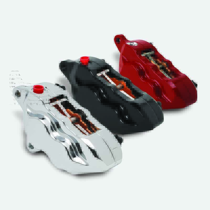 Our latest introduction is the 500 series differential bore 4 piston caliper. Engineered from the ground up, it features a smaller diameter piston at the lead-in of the rotor and a larger piston on the trailing side. The design causes an equalizing of the heat distribution throughout the brake pad to rotor interface which in turn provides optimum friction dynamics. In addition, the differential bore ratio and total volumetric displacement are correctly sized to promote the best brake caliper response and brake lever feel.