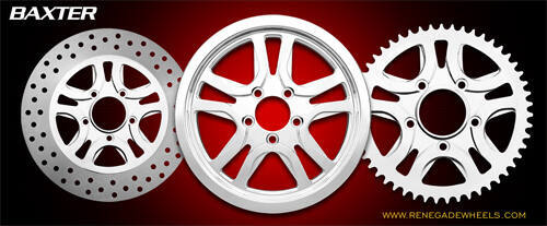 One of our newer designs this split 5-spoke wheel, called the Baxter, has a rock-solid look. The unique way in which the spokes split complements any build whether a Touring Bike or Cruiser. The Black Baxter shows off with stunning detail and smooth contours that will turn heads on the road or at a special event. HHI / Renegade offers matching True Floating Brake Rotors in 11.5,11.8, 13 and 18-inch sizes and you can complete your design package with a matching air cleaner, pulley or sprockets.