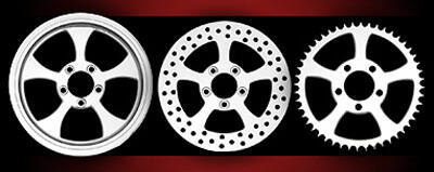 Most Renegade wheel designs are available in Chrome, Phantom-Cut, Black Powder coat and our new custom colour finishes of Aztec Red, Cobalt Blue, and Inca Gold.  Diameters available in 16” thru 32”,  now available in 18, 21 & 23 x 5.5 Front Wide Tire sizes!  Matching Sprockets, Pulleys, Derby Covers and Air Cleaners are available.