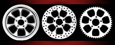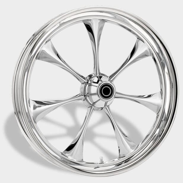 The Phoenix looks amazing in Black or Chrome on just about any style of bike with its edgy 7-spoke design. The dynamic lines contrast the smooth lip rim used on many HHI / Renegade Wheels. Make a statement with this stunning wheel in single or dual brake rotor set up with matching air cleaner, Cog Drive True Floating brake rotors in 11.5,11.8, 13 and 18 inch sizes and your choice of a pulley or sprocket.