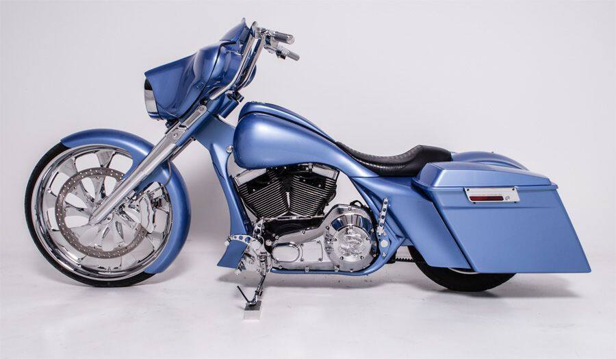 Build #36 HHI Customer Bike 05 Ultra Classic 14" HHI SG Reaper Bars, HHI BFB 18" Rotor/ Caliper Kit, HHI Forward Controls with matching passenger pegs. HHI 26" Wrap Fender, 26" Whistler wheel with matching Air Cleaner, HHI Torpedo Lower Legs, HHI 26" Neck Rake Builders Kit, Aldan Air Suspension, Freedom Sharp Curve Radius Exhaust, extended bags, stretch tank, custom seat, Stretch Rear Fender, Raked Outer Fairing, Custom Windshield, and more. Built at HHI