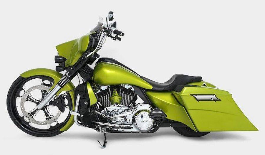 Build #37 Customer Bike GREEN BITCH. Daytona Build. HHI 14" Street Glide Handlebars. HHI Neck Rake Kit. 26" Rapture Phantom Cut Wheel. HHI 18" Matching Rapture Brake Rotor and 6 piston HHI brake caliper. HHI Bomber Lower Legs. HHI Braided Brake lines, FLR Fender and fender spacers. Custom Paul Yaffee Tank. Topshop Black Death Bag & Side Cover Kit. Air FX complete suspension Kit.