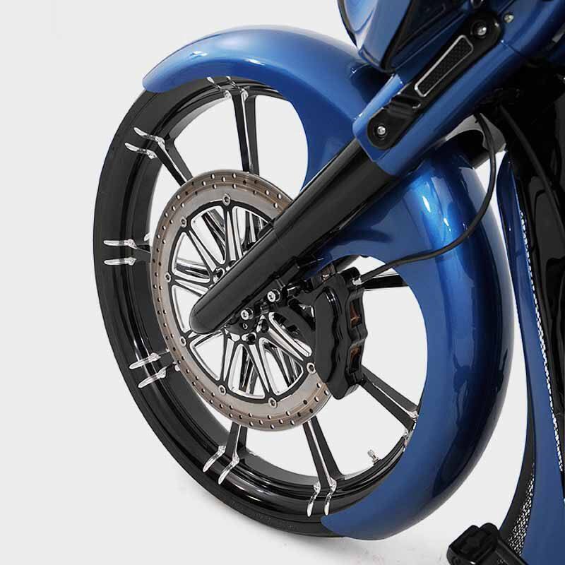 Build #48 2005 Street Glide, HHI 14" SG Reaper Bars, HHI 9 degree Short Neck Builders Kit 12 degree Trees, HHI Torpedo Lower Legs, 30" Renegade Racine Wheel, 18" Renegade Racine Rotor & HHI Caliper, HHI 30" Wrap Fender