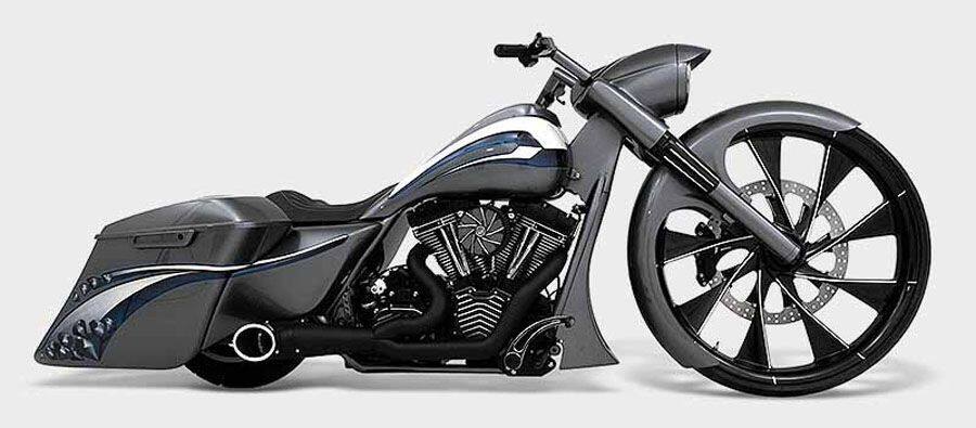 Build #53 09 Road King. 30" Renegade Whistler Phantom Cut Wheel, HHI Hammer Lower legs, HHI Billet Tri-Line +3" Fork Covers, HHI 7" Speed King internally wired Handlebar system, 18" Matching Rotor, HHI 6 piston Caliper, HHI Forward Controls, HHI Short Neck Builders Kit, HHI 30" Wrap Fender, Freedom Performance 2 into 1 Turnout Exhaust, HHI Nacelle.