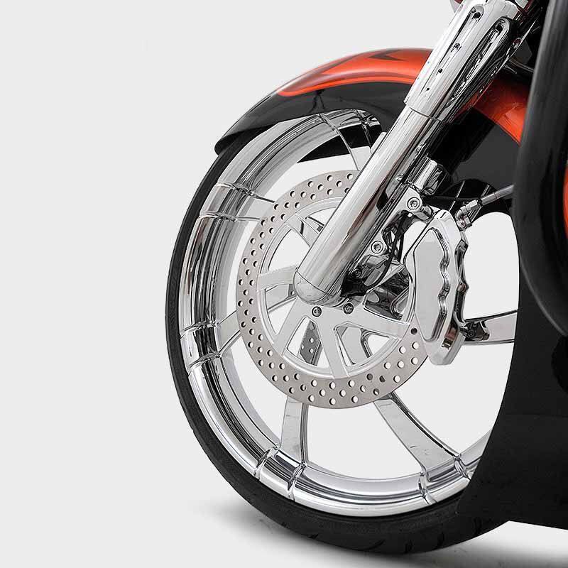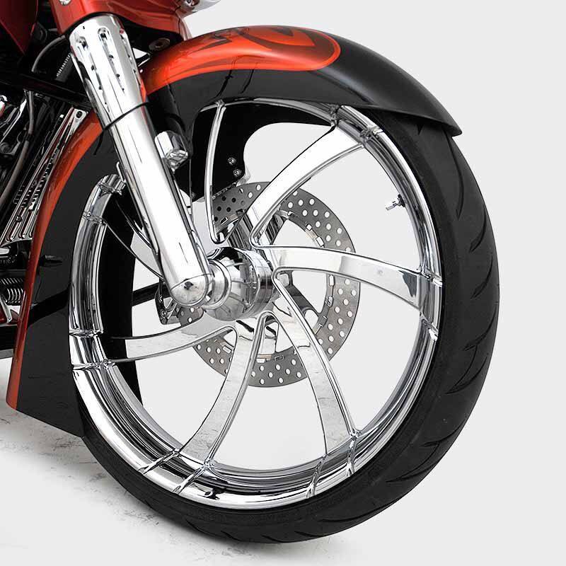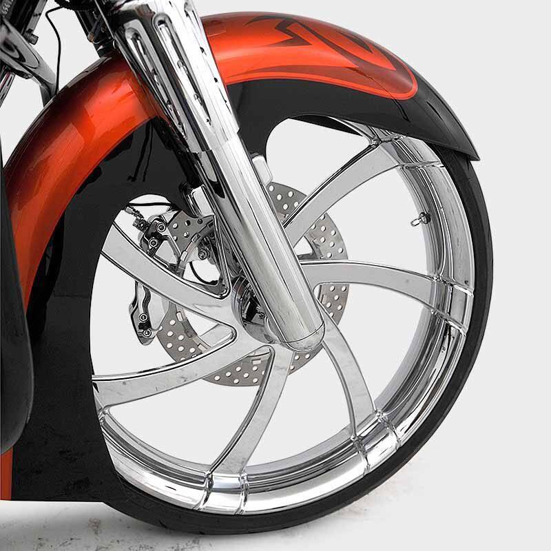 Build #54 14 Road King, HHI Bomber Lower Legs, HHI Billet Tapered Fluted Fork Covers with Holes, 23" Renegade Instigator Front Wheel & Matching 13" Rotor. HHI 6 Piston Caliper, Freedom True Dual Right Side Under Exhaust