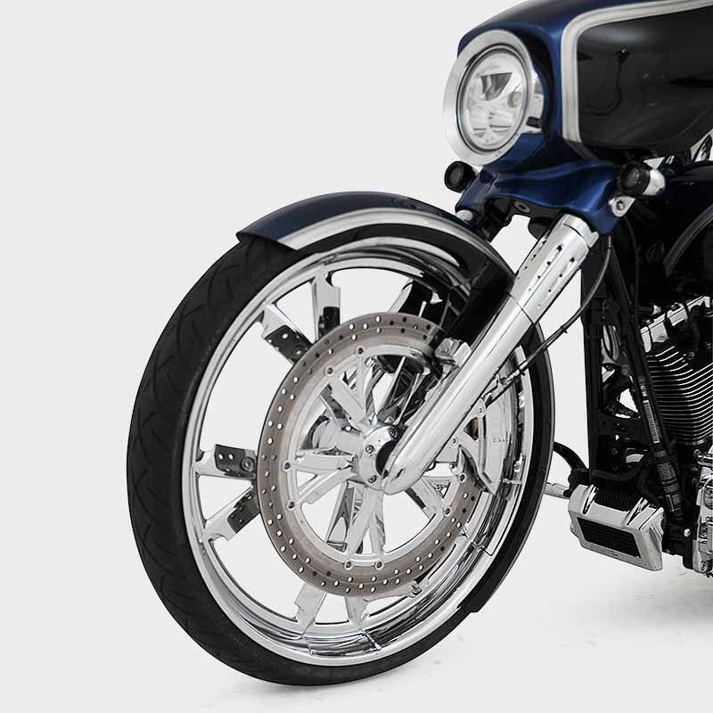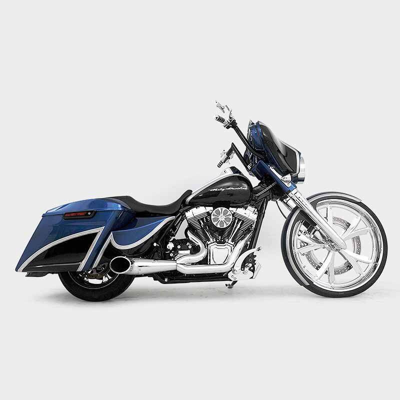 Build #60 2016 Street Glide Special, HHI X26 Bolt-On Rake Kit, HHI Torpedo Lower Legs, HHI Billet Tapered Fluted Fork Covers with Holes, HHI Forward Controls, HHI 14" SG Reaper Internally Wired Handlebars, HHI 26" Steel Wrap Fender, HHI 26" Chrome Spartan Wheel & Matching 18" Rotor, 16x5 chrome rear wheel, AirFX Air Ride front and Rear Suspension. Freedom Performance 2 into 1 Turnout Exhaust, Thundermax ECM, Topshop Viper extended bags, fender and side covers. Baddad speaker lids, Hogtunes upgraded stereo system.