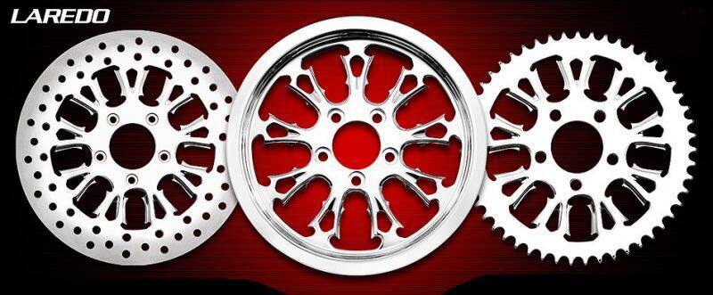 Renegade’s visionary LAREDO is a striking addition to their cutting-edge wheels. This 9-spoke gothic style wheel provides an imposing visual effect to any chopper or Bagger without the “gaudy” overkill. The slender spoke pattern provides a significant weight reduction and less rotating mass, direct bolt-on, matching air cleaner, rotors and pulley are available. All HHI / Renegade Custom Motorcycle Wheels are available in sizes 16" to 32".