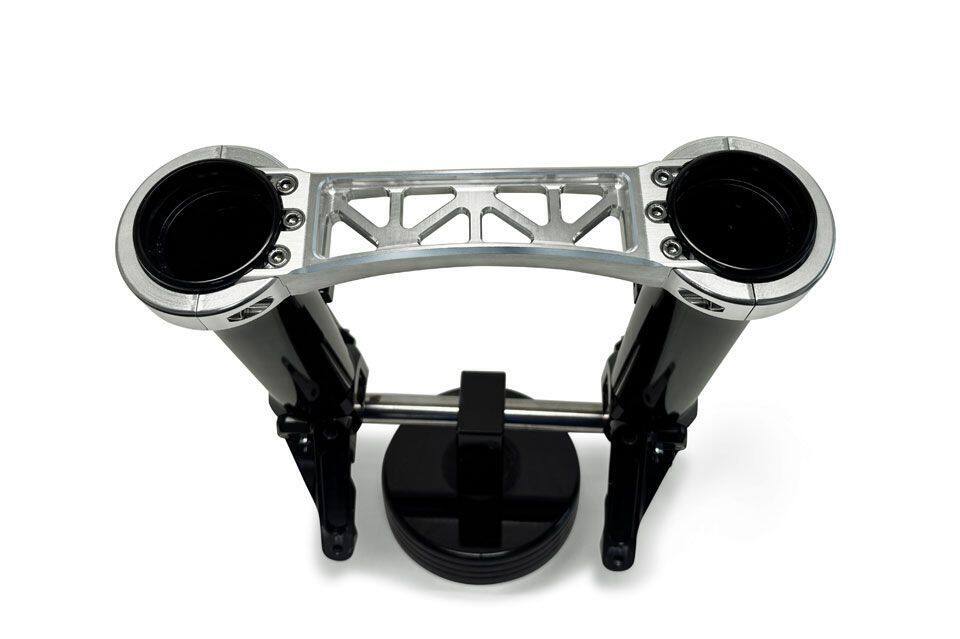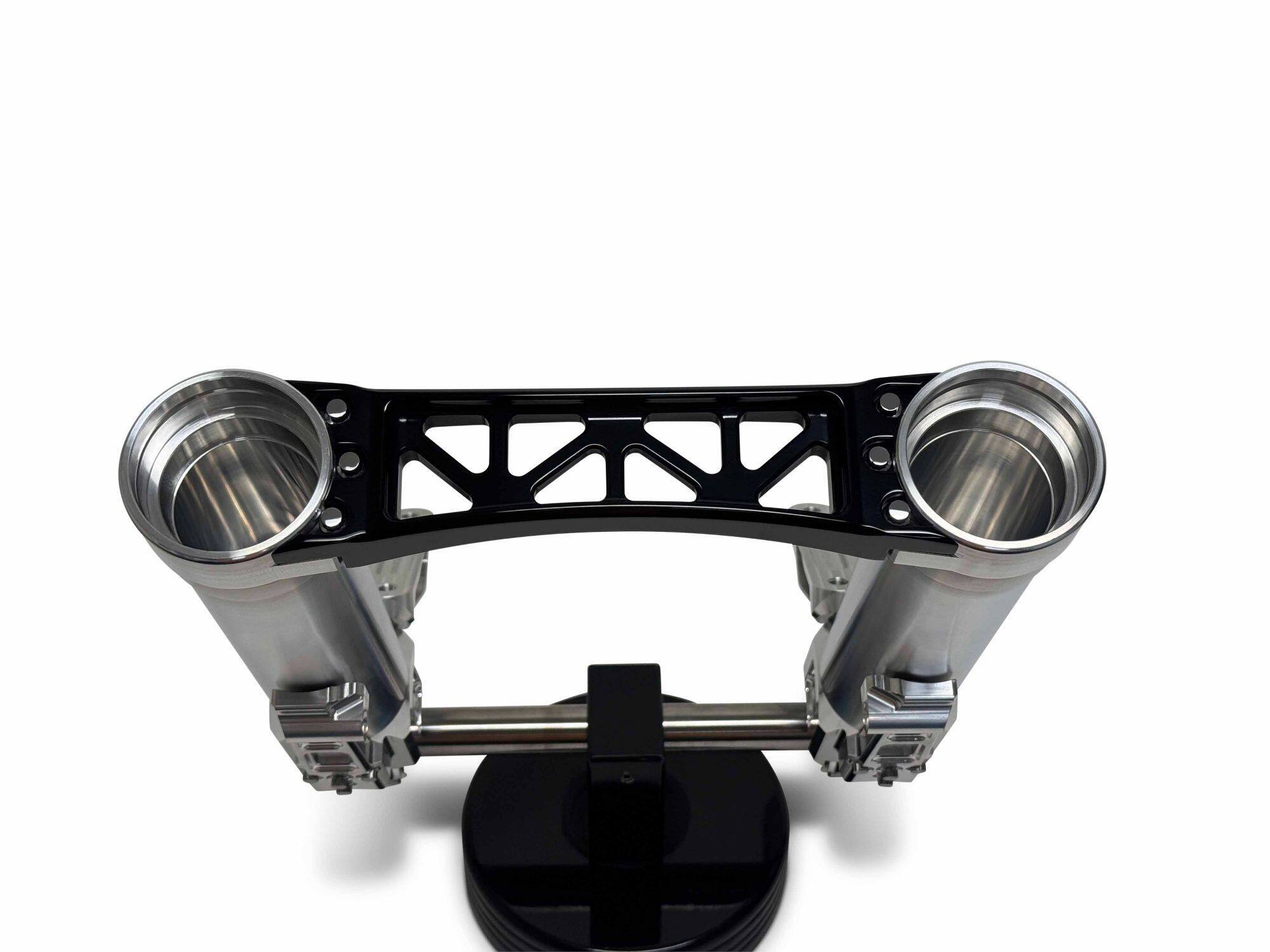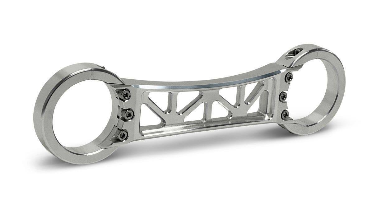 The first is our Bolt-On Billet Fork Brace for popular Touring Bike applications. The robust grade 8 bolt attaching hardware, adjustable clamping design,  and precision fit deliver a tunable installation that is easy to setup and flows well with your custom or stock build.