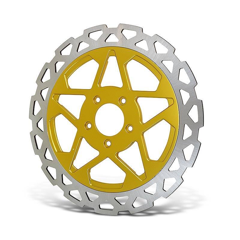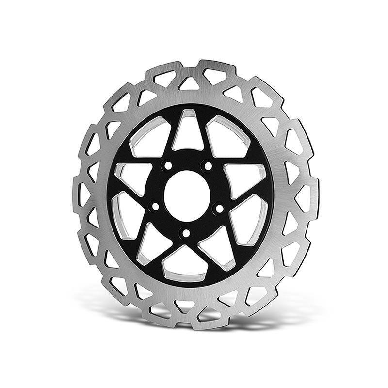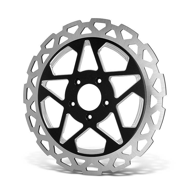 These Precision Rotary Ground, heat-treated 420 Stainless Steel Rotors feature a unique Pentagram cut-out on the friction ring that delivers improved heat dissipation and lighter weight than a standard brake rotor.