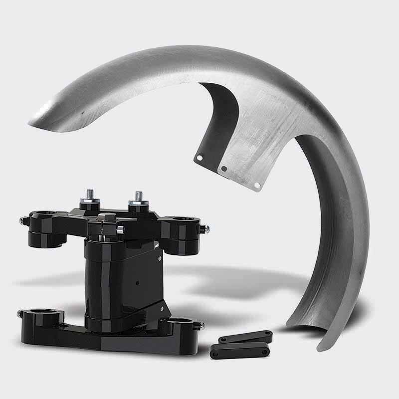 This X-26® Bolt-On Neck Rake Builder Kit includes our X-26® Bolt-On Neck Rake Kit, choice of slim wrap steel fender or stock style FL steel fender & fender spacers available in chrome or black finish.