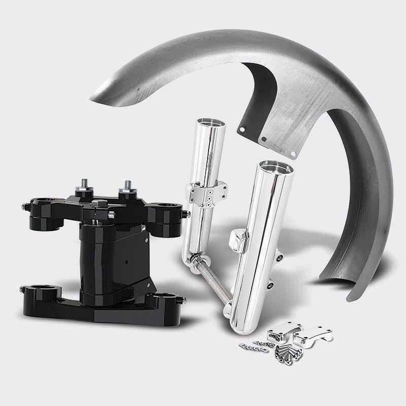 The X 26 Builders Kit includes X-26 ® Bolt-On Neck Rake Kit, slim wrap steel fender or stock style FL fender, & fender spacers, and HHI lower legs, available in chrome or black finish.