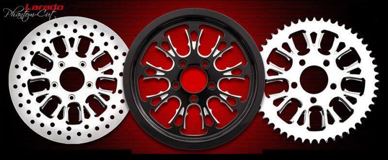 Available in 16" to 32”- inch diameters, with matching Floating Brake Rotors in 11.5,11.8,13 and 18-inch sizes, with a matching Pulley or Sprocket. Phantom Cut wheels are now available in Black, Aztec Red, Inca Gold, and Cobalt Blue