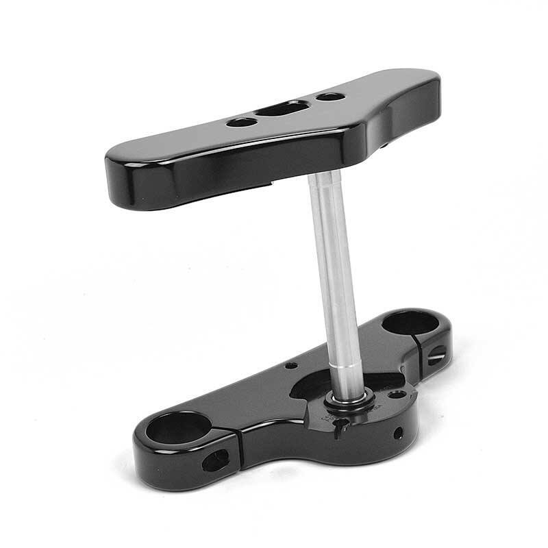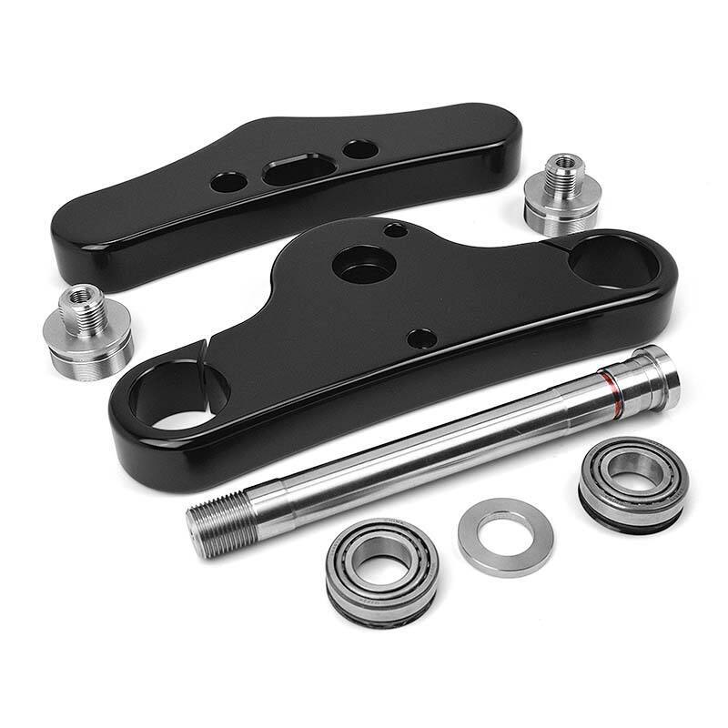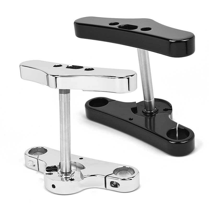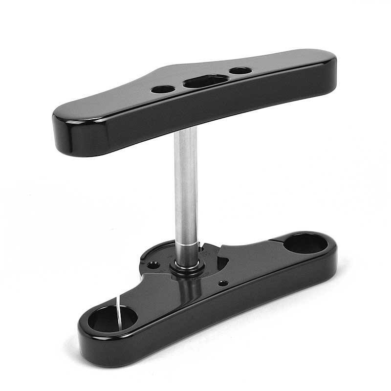 These trees are offered in both the stock mid glide width of 8 1/2" found on the Standard and Streetbob models and wide glide width of 9 7/8" centerline tube to tube measurements. They also have provision for a custom lower mount headlight, and are designed to work with the factory fork stop and fork lock.