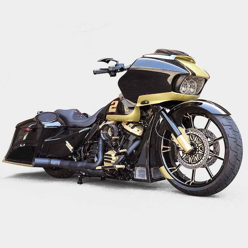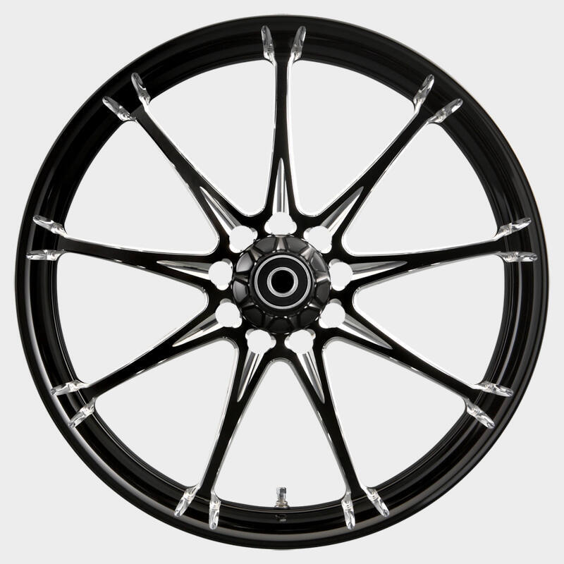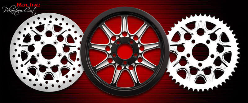 The Racine Phantom Cut wheel is a 9 spoke industry-leading custom design. This Ultra Gloss Black wheel is polished, finished and then re-cut by hand for its special contrast cut accents. Available in 16" to 32”- inch diameters, with matching Floating Brake Rotors in 11.5,11.8,13 and 18-inch sizes, with a matching Pulley or Sprocket. Phantom Cut wheels are now available in Black, Aztec Red, Inca Gold, and Cobalt Blue.