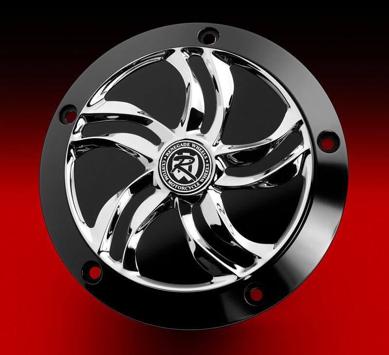 The Renegade Derby Cover is a stunning two piece engineered design. This allows our customers to choose the perfect combination of finishes to complete their bike with. The Derby Base Plate and the Derby Cover are machined from T6061 aircraft aluminum by craftsmen here in the USA. Both the base & cover come in show chrome or black anodized phantom cut and of course we offer cover designs to match all our Renegade or HHI wheel designs.