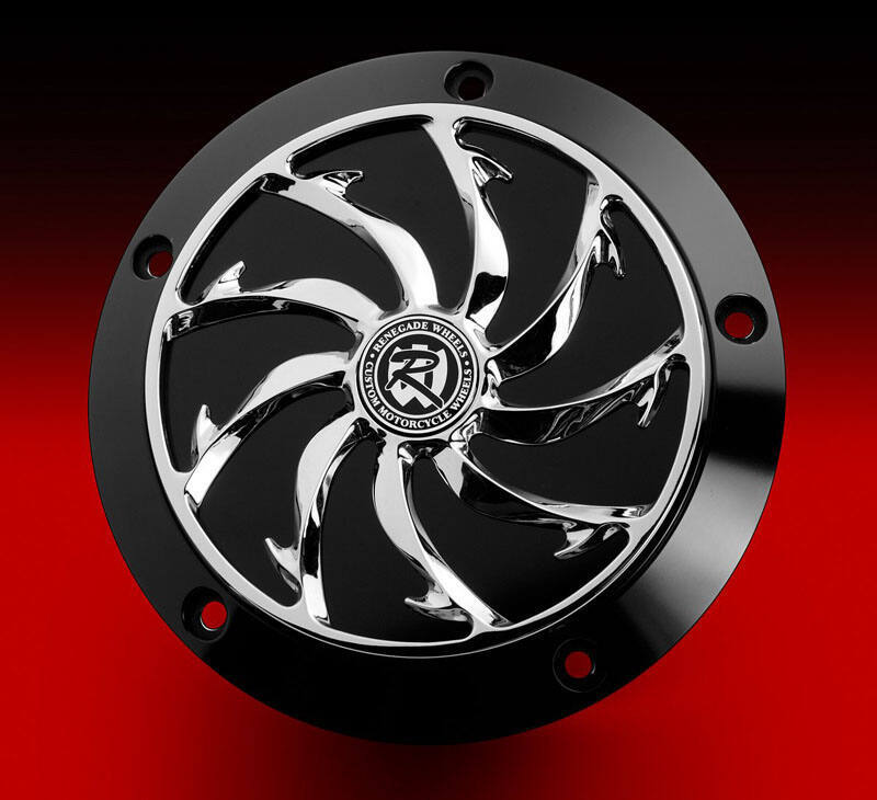 The Renegade Derby Cover is a stunning two piece engineered design. This allows our customers to choose the perfect combination of finishes to complete their bike with. The Derby Base Plate and the Derby Cover are machined from T6061 aircraft aluminum by craftsmen here in the USA. Both the base & cover come in show chrome or black anodized phantom cut and of course we offer cover designs to match all our Renegade or HHI wheel designs.