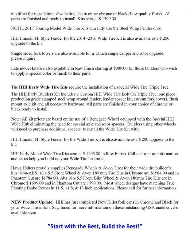 This Wide Tire Package can be ordered as a base kit with the special HHI Wide Triple Tree, HHI Hidden Axle for stock lowers, custom 180/200 Steel Wrap Style Fender, HHI Fender mounts, Spacers and all the hardware you need. The base kit can be expanded with the addition of HHI Billet Lower Legs, with HHI Billet Fender mounts, and a wide range of single or dual HHI Billet Brake Caliper upgrades that include 4 or 6 piston differential bore calipers in 11.5, 11.8 and 13inch brake conversion kits with HHI true floating brake rotors.
