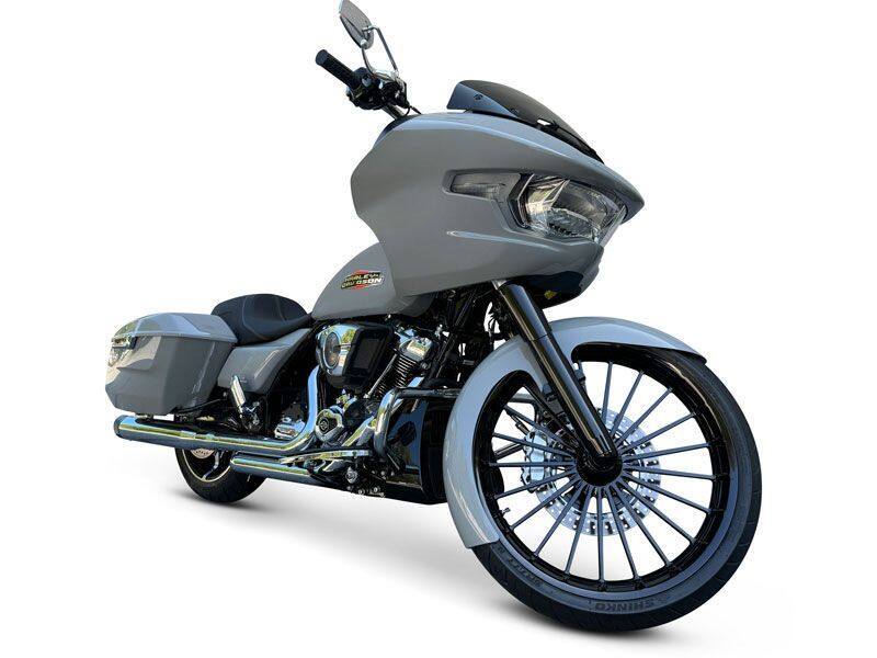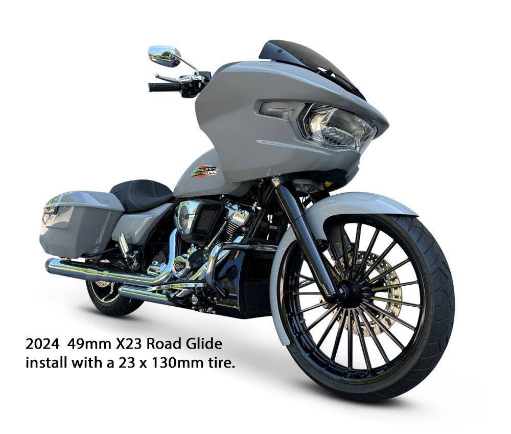 Fitting the NEW 2024-up FLHX Street Glide and the FLTRX Road Glide, HHI now offers a 49MM BOLT-ON raked triple tree kit for a 23"x130mm or 21"x 180mm wheel/tire installation.