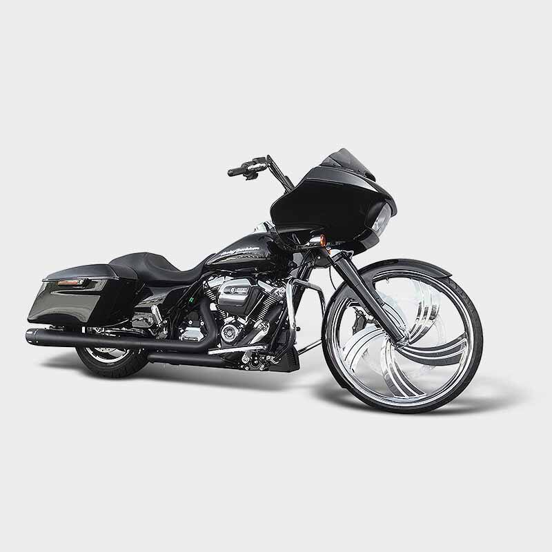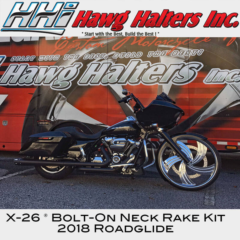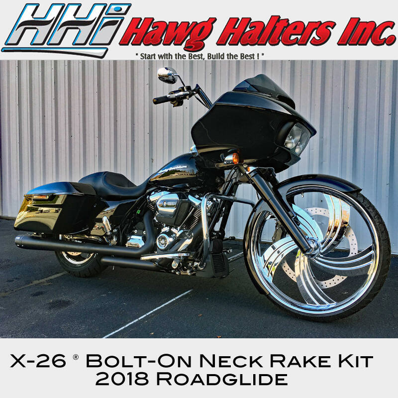 HHI is proud to offer the X-26® family of Bolt-On Neck Rake Kits for 26 inch wheel installation, now also available for the new fairing style 2024 SG & RG Standard Touring models. Designed and manufactured in our facility using only USA produced 6061- T6 billet aluminum and 4150 high strength steel alloy, this leading edge, multi piece neck design delivers unmatched strength and secure attachment. Based on proven press fit technology the results are perfect frame alignment, maximum assembly and installation rigidity with superior performance and handling.